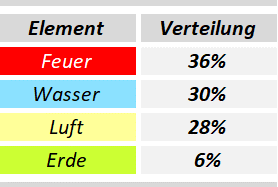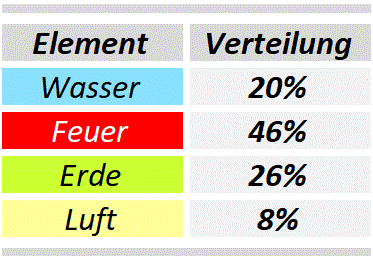 Eine Feuer-Überbetonung mit 36% weist hin auf ein hohes Potential an Lebensenergie, auf Mut, Entschluss- und Tatkraft.